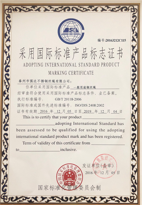 泰州市強達不銹鋼絲繩有限公司位于江蘇興化市戴南經濟開發(fā)區(qū),公司致力于不銹鋼絲繩產品生產,立志成為“國內技術標桿型吊索具生產企業(yè)”。以此戰(zhàn)略思想指導,公司堅決貫徹“質量贏市場,管理增效益,誠信贏天下”的質量方針。以完善的服務在國內不銹鋼絲繩市場樹立良好的品牌形象。公司榮獲“江蘇省質量信得過企業(yè)。     靈活的管理機制,經驗豐富的